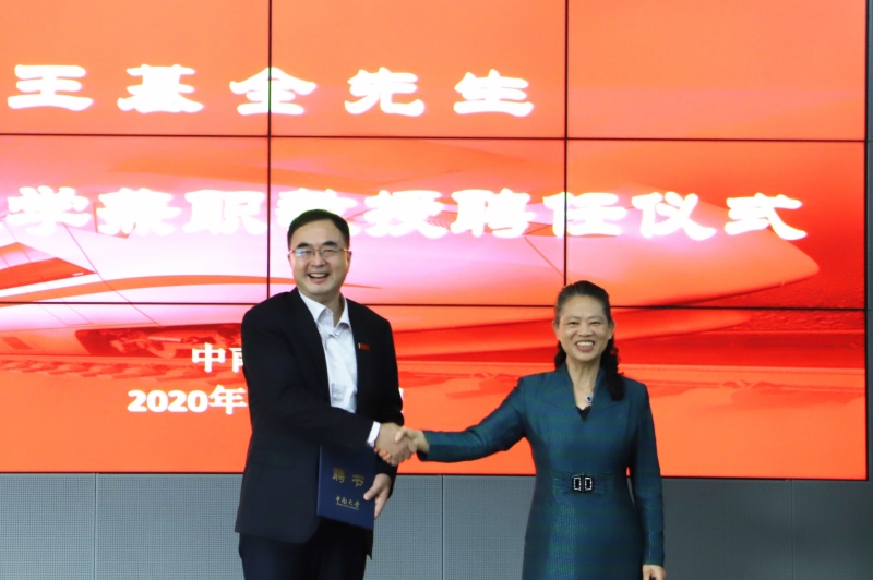 會(huì)議首先舉行了“王基全先生中南大學(xué)兼職教授聘任儀式”,田紅旗校長為王基全總經(jīng)理頒發(fā)了兼職教授聘書、佩戴了中南大學(xué)校徽并合影留念。