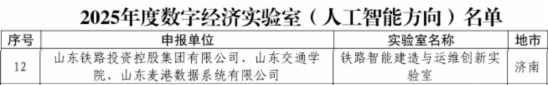 日前,山東省工業(yè)和信息化廳公布了2025年度山東數(shù)字經(jīng)濟創(chuàng)新平臺名單,集團牽頭申報的“鐵路智能建造與運維創(chuàng)新實驗室(人工智能方向)”成功入選,成為本次25家獲批單位之一,標(biāo)志著集團在人工智能關(guān)鍵技術(shù)研究與創(chuàng)新應(yīng)用方面邁出了堅實一步。