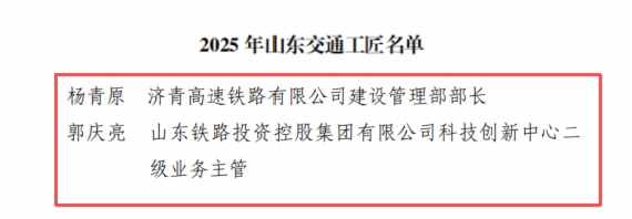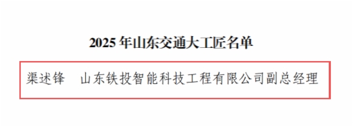 為大力弘揚勞模精神、勞動精神、工匠精神,努力建設知識型、技能型、創(chuàng)新型交通運輸職工隊伍,2025年,山東省交通運輸廳、山東省總工會組織開展了“山東交通工匠”培育工作,通過逐級推薦、綜合評審、實地考察、集中培育等環(huán)節(jié),確定10名同志為“山東交通大工匠”、30名同志為“山東交通工匠”。其中,山東鐵投智能科技工程有限公司副總經(jīng)理渠述鋒榮獲“2025年山東交通大工匠”;濟青高速鐵路有限公司建設管理部部長楊青原、山東鐵路投資控股集團有限公司科技創(chuàng)新中心二級業(yè)務主管郭慶亮榮獲“山東交通工匠”。