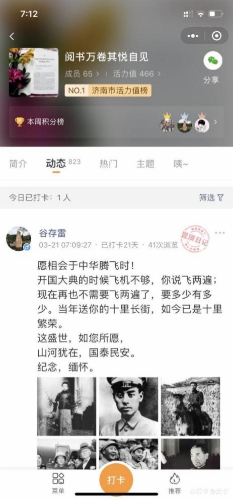 活動(dòng)共設(shè)置三個(gè)學(xué)習(xí)主題,并利用微信小程序建立起活動(dòng)陣地——“閱書萬卷其悅自見”悅讀圈?;顒?dòng)中,大家自選書籍,堅(jiān)持每日閱讀,并在悅讀圈進(jìn)行打卡,分享讀書計(jì)劃、讀書筆記,交流讀書心得、讀書收獲。大家分享的內(nèi)容豐富多彩,精致雋永,有語重心長(zhǎng)的心靈感悟,有精彩紛呈的人生游記,有陶冶心靈的詩詞朗誦,也有振奮人心的工作場(chǎng)景,一度在微信小程序中躍居“濟(jì)南市活力值榜”之首。