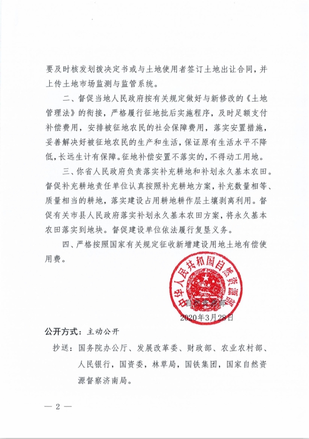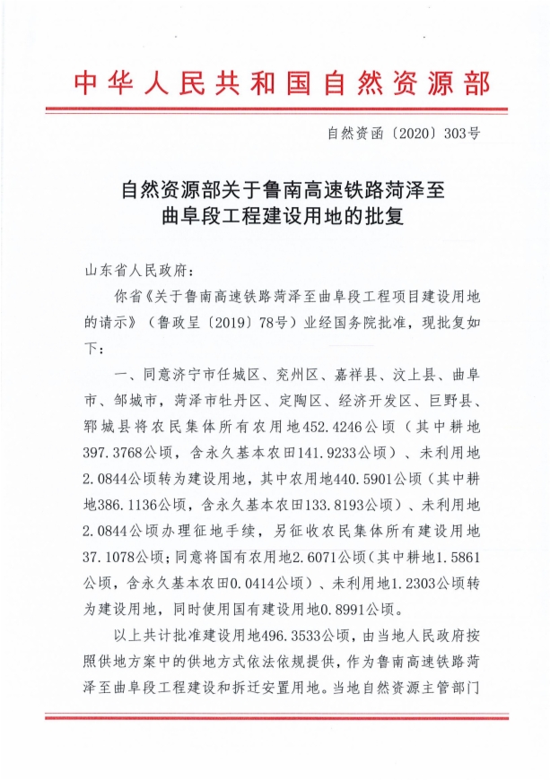 附:《自然資源部關于魯南高速鐵路菏澤至曲阜段工程建設用地的批復》(自然資函〔2020〕303號)