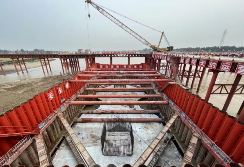 此次澆筑的P39#主墩承臺(tái)為51.1×23.5×5米(長(zhǎng)×寬×高)的啞鈴型承臺(tái),采用C45混凝土分兩層澆筑完成,澆筑總方量約5500立方米,鋼筋總量約541噸,承臺(tái)處開挖深度達(dá)到15米,施工難度大。承臺(tái)基坑采用鎖扣鋼管樁圍堰進(jìn)行支護(hù),同時(shí)運(yùn)用圍堰監(jiān)測(cè)、智能溫控系統(tǒng)等數(shù)字化和智能化手段,實(shí)時(shí)對(duì)圍堰下水的高度、平面位置、傾斜度進(jìn)行監(jiān)控,并對(duì)大體積混凝土實(shí)時(shí)監(jiān)測(cè)、自動(dòng)調(diào)控和可視化管理,保證承臺(tái)施工的質(zhì)量及安全。