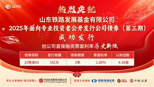 近日,山東鐵投集團(tuán)權(quán)屬山東鐵路發(fā)展基金有限公司(以下簡(jiǎn)稱基金公司)成功發(fā)行5億元公司債券,3年期票面利率低至1.85%,認(rèn)購(gòu)倍數(shù)達(dá)4.36倍,創(chuàng)公司直接融資票面利率歷史新低。本期債券成功發(fā)行,有利于降低鐵路發(fā)展基金整體融資成本,持續(xù)賦能未來業(yè)務(wù)發(fā)展。